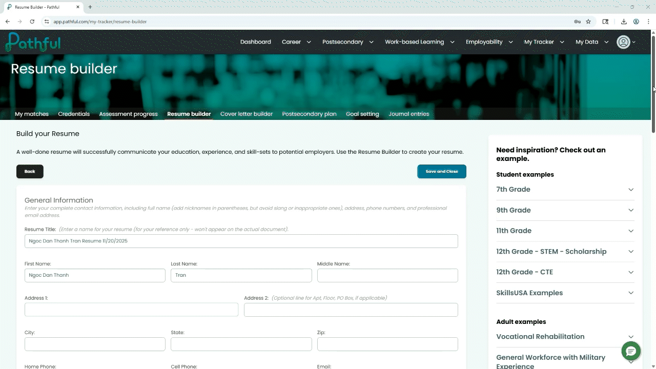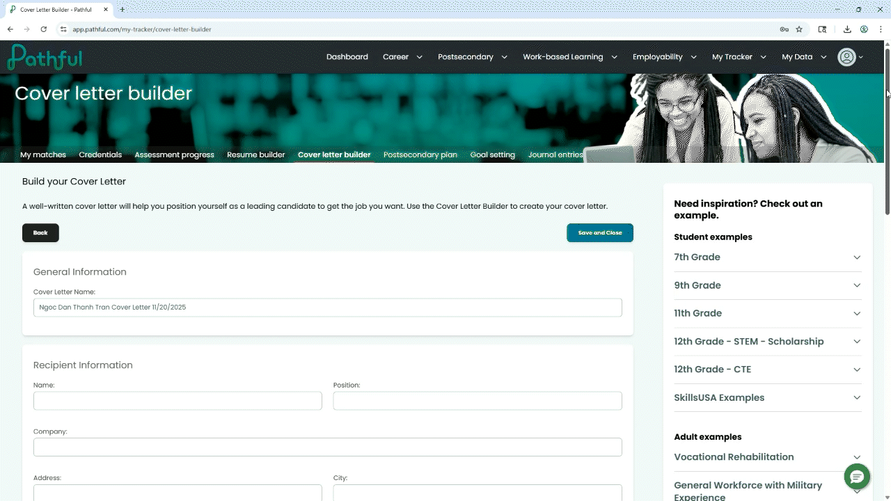 Creating a strong Resume or Cover Letter is an important step in preparing students for real world opportunities. Pathful’s Resume Builder and Cover Letter Builder give students a simple, supportive place to practice professional writing, build confidence, and present their growing skills. Because both tools live inside the My Tracker tab, students can return to their work anytime, update their documents, and download polished copies to share with employers, internship coordinators, or postsecondary programs.