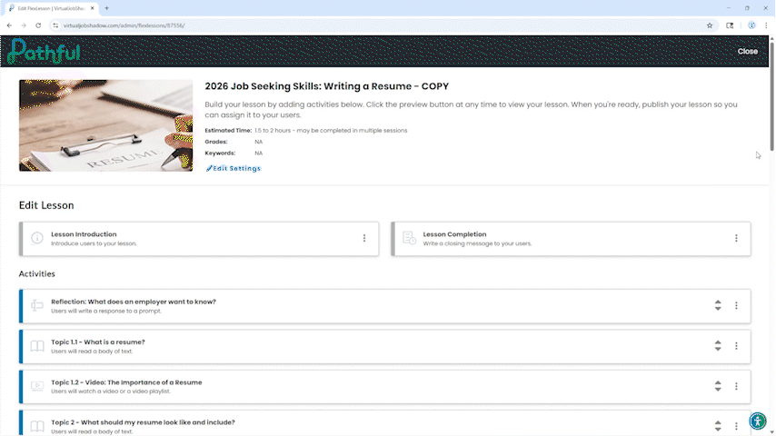 Learn how to build Custom FlexLessons in Pathful by cloning or creating lessons from scratch, reordering activities, editing prompts, and adding accountability. This beginner-friendly guide walks educators through simple, practical ways to personalize lessons and reuse them with confidence.