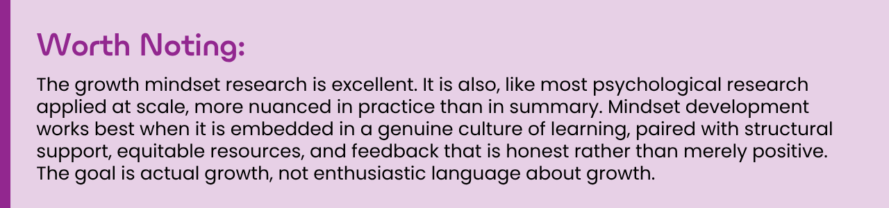 - Praise process, not just outcome. Recognize effort and strategy in conjunction with learning — not as substitutes for it. "You tried a new approach and it led to improvement" is better than "great effort!" which, as Dweck noted, can feel hollow when accompanied by ongoing failure. The video “Growth Mindset Indications" and the lesson Having a Growth Mindset Allows You to Grow reinforce this distinction in student-accessible language.