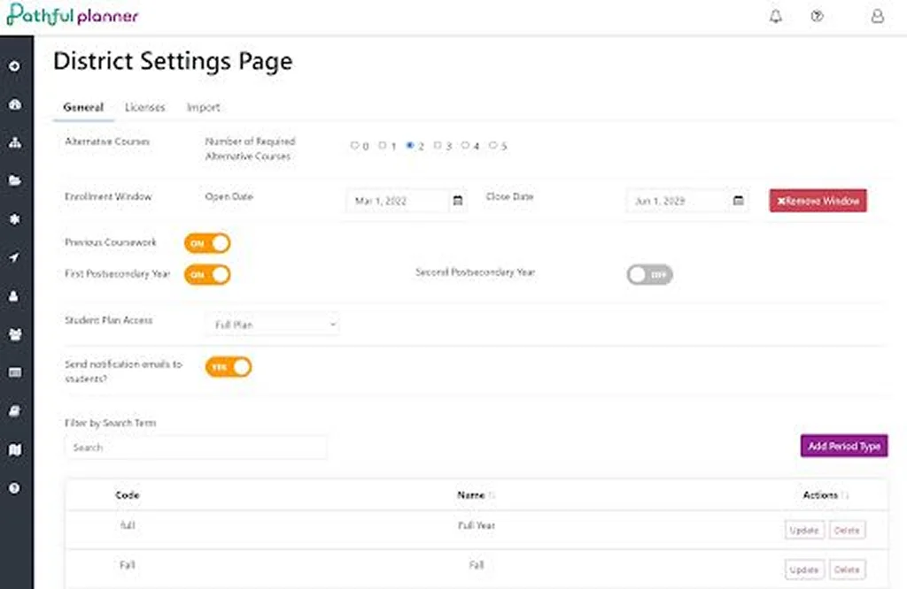 Administrators define when students can pick courses, which grades and years are viewable, and the number of alternative courses they must select.