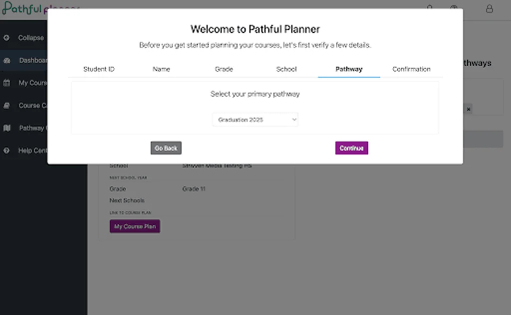 Without counselor assistance, students get a step-by-step walkthrough that confirms all student information is correct and introduces them to the platform.